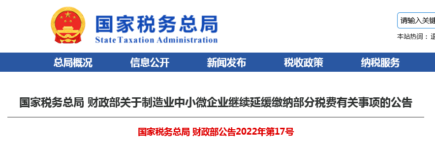 2022年9月14日,国家税务总局、财政部联合发布《关于制造业中小微企业继续延缓缴纳部分税费有关事项的公告》(国家税务总局 财政部公告2022年第17号,以下简称《公告》),明确制造业中小微企业(含个人独资企业、合伙企业、个体工商户)继续延缓缴纳部分税费政策有关事项。